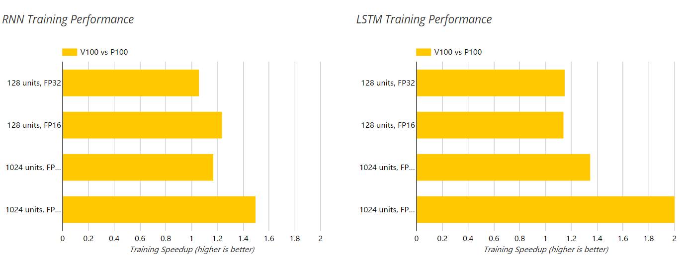 虽然 V100 与 P100 相比显示出强大的硬件性能提升,但深度学习中擅于处理时序数据的循环神经网络无法充分利用 V100 这种专门化地硬件加速,因此它只能获得有限的性能提升。