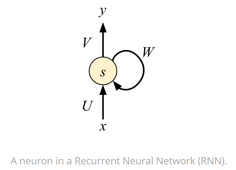 下图展示了 RNN 中的一个神经元,它不仅是最基础的组成部分,同时还是其它更复杂循环单元的基础。下图可以看出该神经元的输出 y 不仅取决于当前的输入 x,同时还取决于储存的前面状态 W,前面循环的状态也可以称之为反馈循环。正是这种循环,RNN 能够学习到时序相关的依赖性。