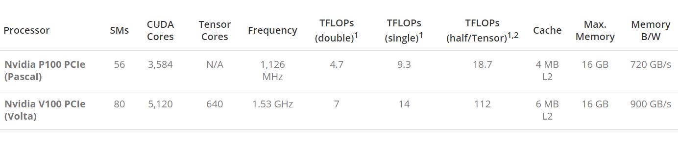下表展示了英伟达 P100 和 V100 GPU 的关键性能与不同点。