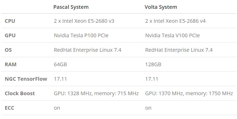 我们比较了模型在 Pascal 和 VoltaGPU 上的性能,且系统所使用的配置如下所示: