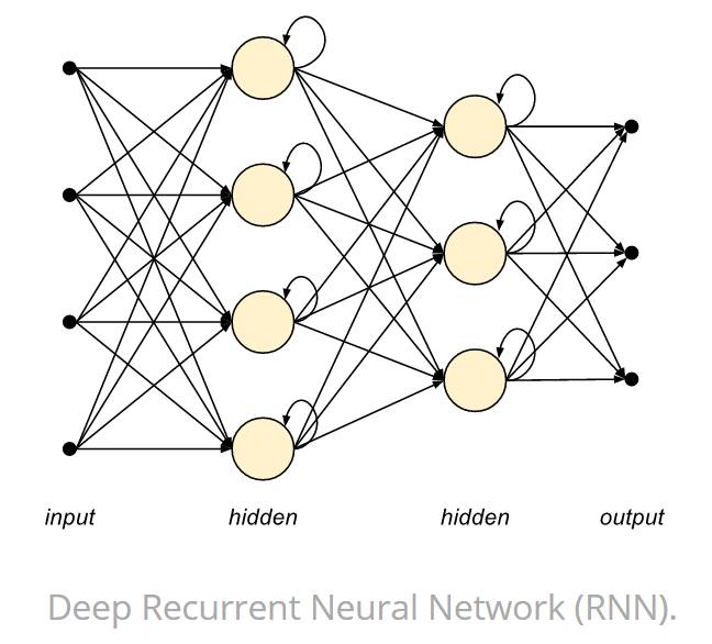 如下图所示,RNN 单元可以组织成一个个层级,然后再堆叠这些层级以组织成一个完整的神经网络。