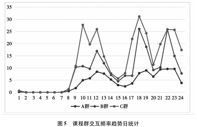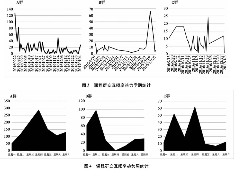 从周统计来看,三个课程群的交互峰值均出现在上课的前一天,最低谷则出现在课程结束后的第二天(图4)。上课的前一天学习者有了解该周次课程安排的需求,会出现交互的高峰;课程结束后的两天意味着一周次课程周期的结束,学生会相对放松,对该课程投入精力减少。