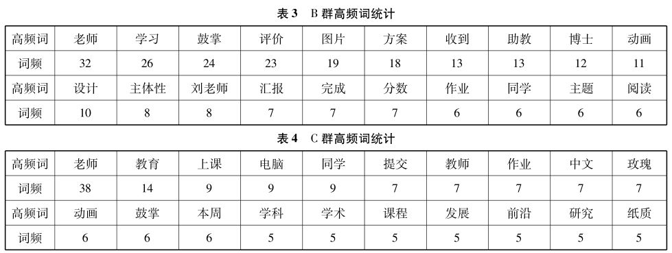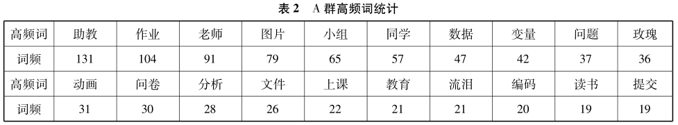 三个课程群中“教师”“助教”“作业”“上课”“提交”等教务相关信息均出现频率较高;“图片”“玫瑰”“动画”“流泪”“鼓掌”等表情符号也被经常使用。A群中与课程内容直接相关的“数据”“变量”“问卷”“分析”“编码”“问题”等关键词也有较高的出现频率,但B群与C群中几乎没有出现与课程内容直接相关的高频词。