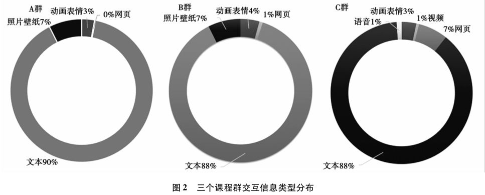 在交互信息类型的选择上,三个课程群基本一致,均以文本为主要载体,占总信息量近90%;表情符号、图片也被大量使用,A群和B群占到了10%左右;网页链接也常有出现,且在C群中占到7%。C群信息中出现了语音跟视频(如图2所示)。
