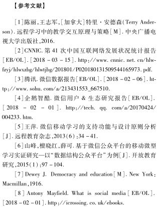 教学交互是教学的重要组成部分[7],是学习者与学习环境相互交流和相互作用而追求自身发展的过程。远程学习中的教学交互是教与学再度整合的过程,决定了学习是否发生及发生的水平[1]。媒体在非面对面的学习情境中至关重要,关乎交互的水平与质量。社交媒体具有参与、公开、交流、对话、社区化、连通性等特征[8],可以把图片、视频、文本和传统内容进行混搭处理并进行互动,建立“联系”和生成“意义”[9],在教育教学中的应用场景日益多样化。已有研究表明,基于社交媒体可以构建网络学习共同体[10-11]、调动学习者的积极性、提高学习效果,较BBS、BLOG等工具,学习者之间沟通更加方便[12-13]。不同社交媒体的交互性不同,对教学交互的支持也有差别[14]。微信已成为我国用户最多的社交媒体,被广泛地应用于教育领域,有不少学者对其教育应用进行了相关研究。通过文献研究发现,主要包括微信、微信群交互性的研究及基于微信、微信群或公众平台教学设计与实施的研究两大类。