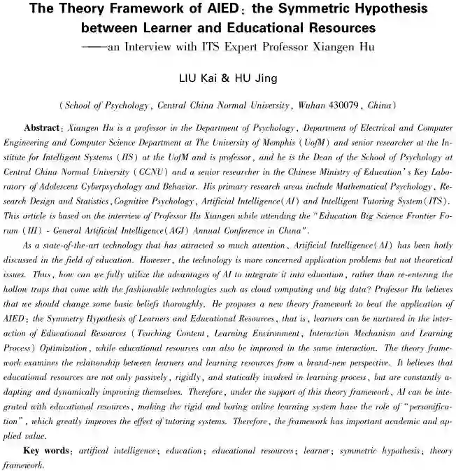 胡祥恩教授是美国孟菲斯大学心理学系、电子计算机工程系、计算机科学系教授,智能系统研究院高级研究员,美国先进分布式学习孟菲斯实验室主任,华中师范大学心理学院院长、中国青少年网络心理与行为教育部重点实验室高级研究员,研究领域包括数学心理学、实验设计与统计、心理学、人工智能和智能导学系统。本文系2018年7月华中师范大学举办的“教育大科学前沿论坛(第三期)一中国通用人工智能高端论坛”会议期间对胡祥恩教授访谈基础上整理而成的。