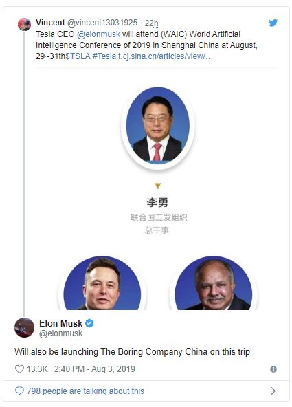 马斯克将于8月29日至31日在上海举行的世界人工智能会议上发表演讲。演讲中将回应关于他关于此事的推文:“此次旅行还将推出The Boring Company China。”