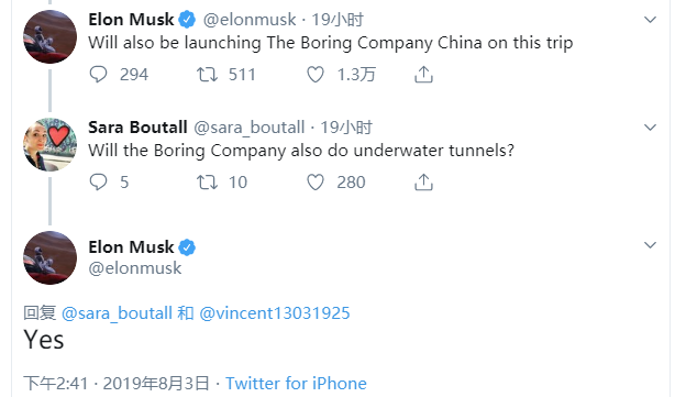 另一位Twitter用户回复,询问马斯克是否也会涉及水下隧道业务 - 马斯克回答说“是的”。