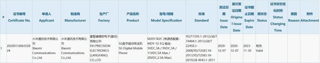 根据消息,小米 11 已正式入网,目前我们已经可以看到小米 11 通过了国家 3C 入网认证。由认证信息我们可以看到,小米11由富智康电子制造,标配全新的 11V5A 快充。而在不久前,小米就有一款相同规格的充电器入网。