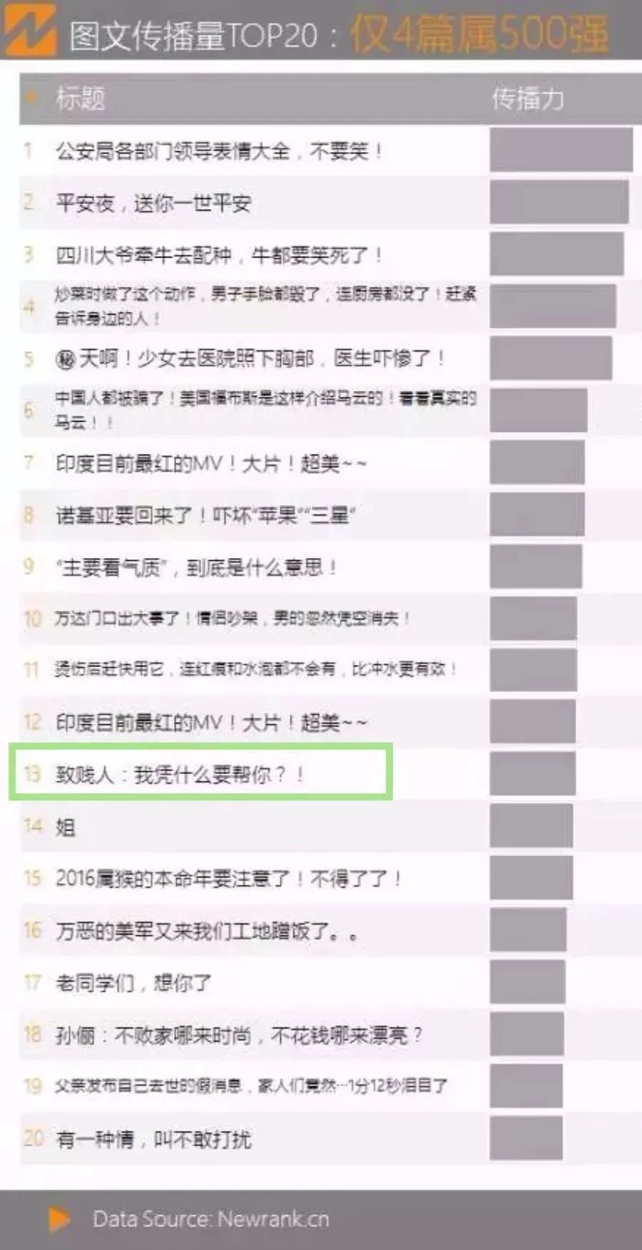 仔细看,其中有一篇是“微信人民的老朋友”咪蒙的成名作《致贱人》,可惜连前十都进不了,因为话题还不够“大众化”,标题还不够“震惊”,情绪挑逗还不够“酸爽”。