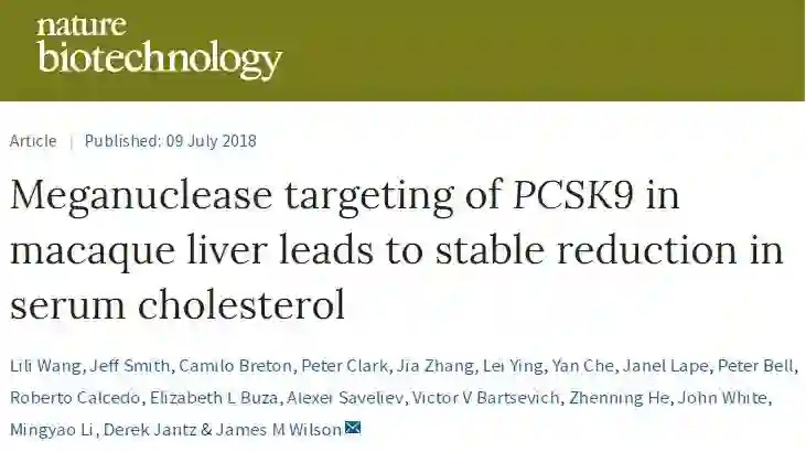 这些成果于7月9日以“Meganuclease targeting of PCSK9 in macaque liver leads to stable reduction in serum cholesterol”为题发表在Nature Biotechnology上。