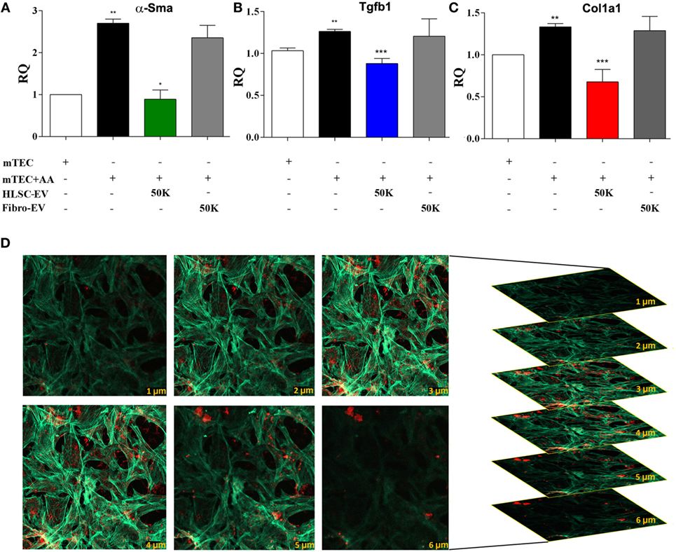 图: 人肝干细胞衍生的细胞外囊泡(HLSC-EVs)在马兜铃酸肾病的体外模型中下调促纤维化基因.