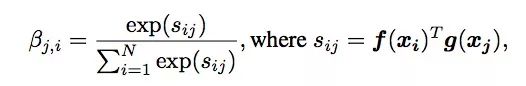 βj,i,是f(x)⊗g(x)经softmax后的结果,表示模型合成j区域图像内容时i区域的参与程度,即相关性;