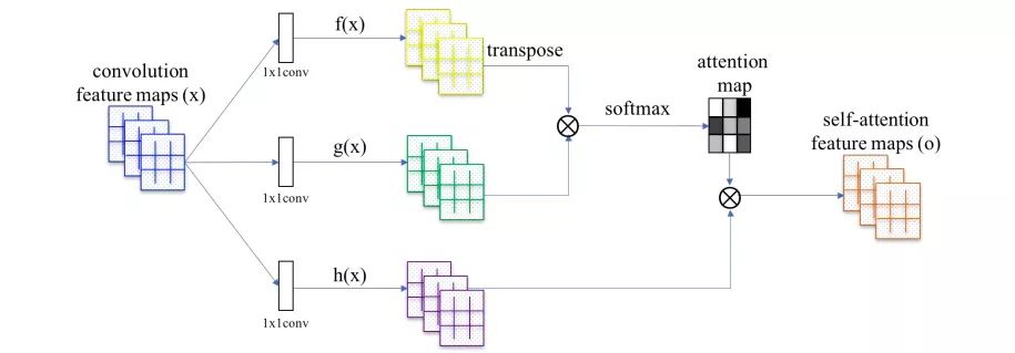 SAGAN中的自我注意力模块:⊗表示矩阵乘法,每一行都用Softmax归一化