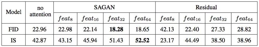 他们比较了自我注意力模块和残差模块在GAN中的表现。这些模块被添加到网络的不同层,整个模型进行了上百万次迭代的训练。实验结果证明,无论是FID还是IS,自我注意力模块的表现都是最好的。