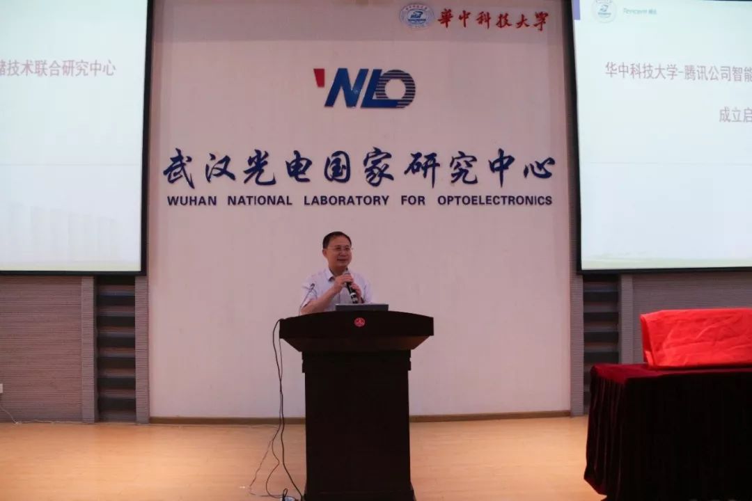 华中科技大学副校长骆清铭、腾讯公司副总裁王巨宏、腾讯公司基础架构部总经理肖志立、联合研究中心主任周可教授共同为研究中心揭牌。武汉光电国家研究中心党委书记夏松、腾讯公司产学合作高级总监刘婷婷、华中科技大学科发院副处长李江华、武汉光电国家研究中心副主任周军、武汉光电国家研究中心副主任朱丹、腾讯公司产学合作总监陈伟,以及武汉光电国家研究中心的老师和同学们共同见证了联合研究中心的成立。