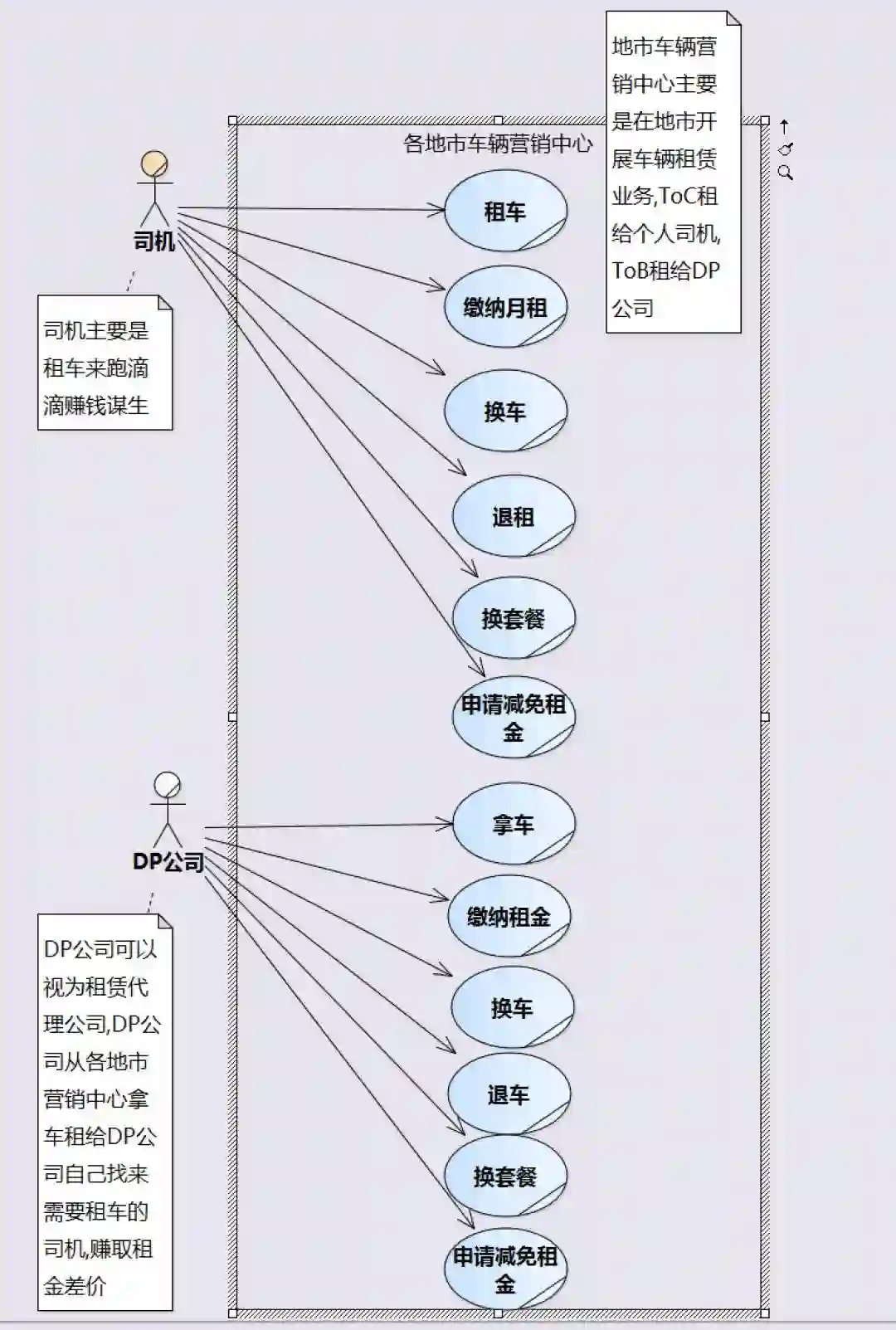 那这个以各地市车辆营销中心为研究对象画的业务用例图,只有2个业务用例? 司机->租车 , DP公司->拿车 ?