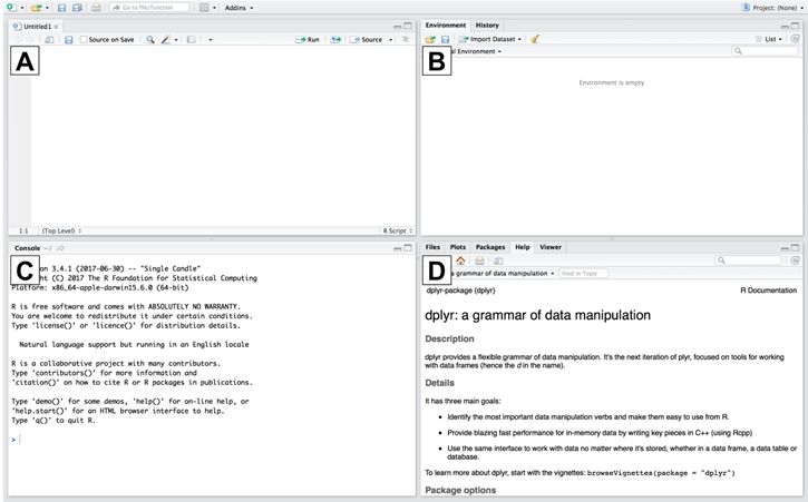 打开RStudio时,屏幕如上图所示。四个窗格分别是:(a)一个文本编辑器。(b)一个开发环境的控制面板。(c)R解释器。(d)帮助窗口和包管理系统。这些特性使得它能够成为在你安装R语言之后真正需要的RStudio。新手们经常问的一个问题是如何在R中安装软件包。下面的视频演示了使用RStudio的包管理器安装tidyverse的一个方法。