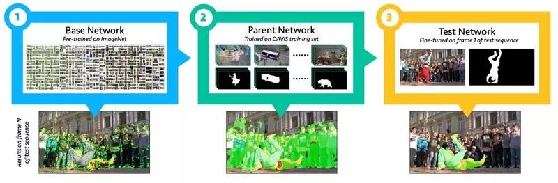 这个过程将生成一个独特的模型,每一个新视频都只使用一次该模型,根据第一帧注释,该模型对于每个视频都是过度拟合的。因为对于大多数视频来说,对象和背景的外观并没有完全改变,这个模型产生了很好的效果。当然,这种模型对其他随机视频镜头来说效果较差。