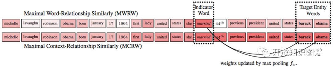 (1) Relationship-dependent content masking:强调留下和任务相关的词,抹去不相关的单词; 模型采用attention机制基于相似度得到上下文的词和给定关系的词的权重矩阵,通过观察发现目标实体有时候在权重高的词(indicator words)附近,提出 MCRW 考虑了上下文的权重求解方法。