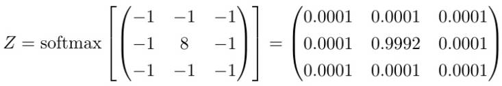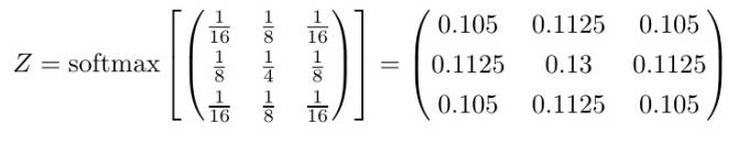我们可以通过正规化来讲卷积核转化为概率密度函数。这有点像计算输出值的softmax。下面就是对第一个例子中的卷积核执行的softmax结果: