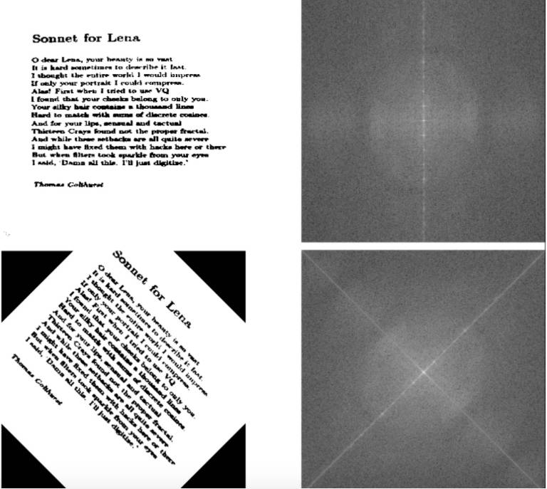 我们马上就可以发现傅里叶变换包含了关于物体朝向的信息。如果物体被旋转了一个角度,从图像像素上可能很难判断,但从频域上可以很明显地看出来。