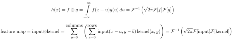 第一个等式是一维连续域上两个连续函数的卷积;第二个等式是二维离散域(图像)上的卷积。这里指的是卷积,指的是傅里叶变换,表示傅里叶逆变换,是一个正规化常量。这里的“离散”指的是数据由有限个变量构成(像素);一维指的是数据是一维的(时间),图像则是二维的,视频则是三维的。