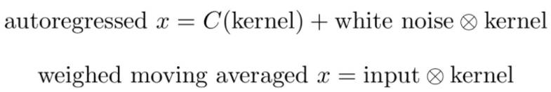 现在如果我们将C作为bias,我们就会觉得这与卷积神经网络很像。所以卷积层的输出可被解释为白噪音数据经过autoregressive model的输出。