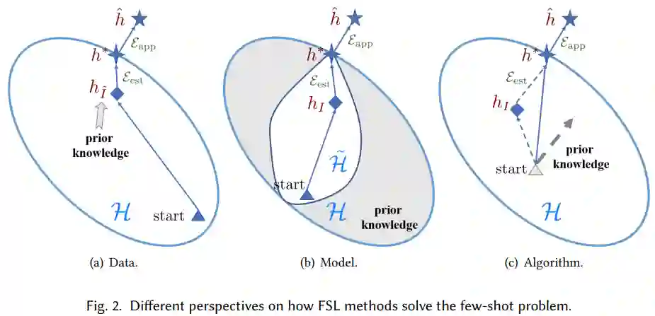 从数据、模型和算法三种不同视角来观察 FSL 方法如何解决小样本问题。