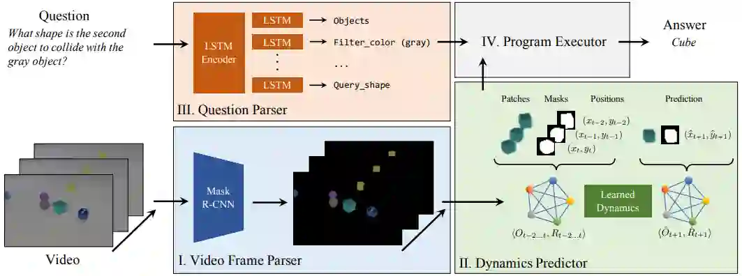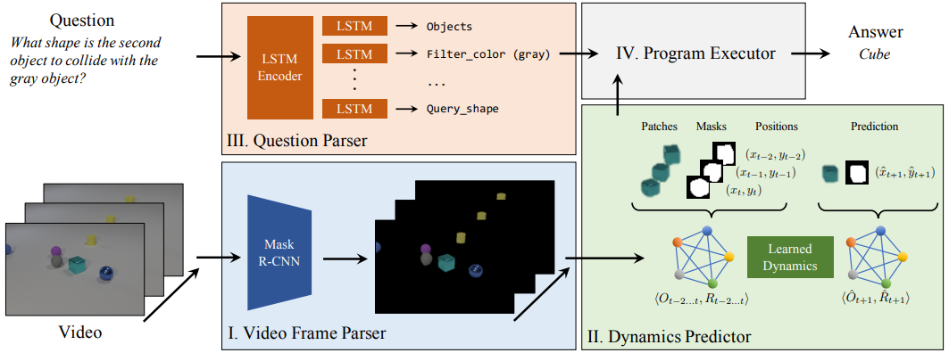 NS-DR 模型结合了用于模式识别和动力学预测的神经网络,以及用于因果推理的符号逻辑,包含四个组件:视频解析器、动态预测器、问题解析器和程序执行器。
