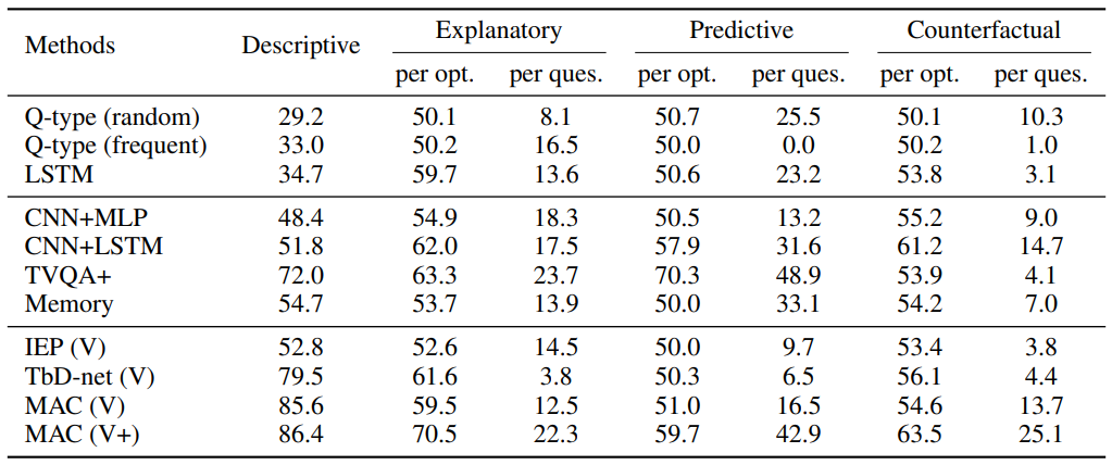研究者对各种最新的视觉推理模型在 CLEVRER 上进行了评估,结果显示,尽管这些模型在描述性问题上表现良好,但它们缺乏因果推理的能力,并且在解释性、预测性和反事实问题上表现不佳。