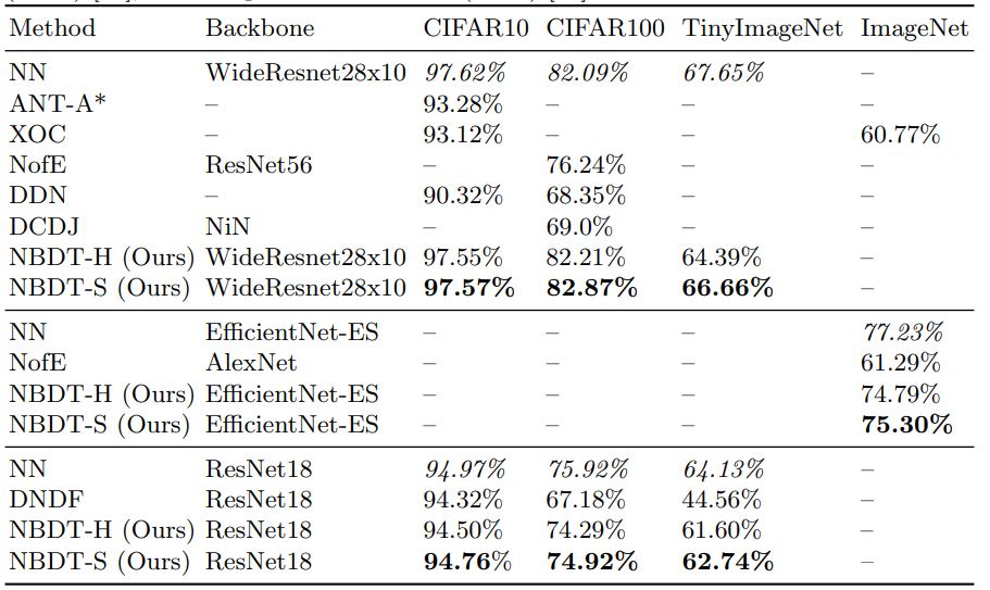 在 CIFAR10、CIFAR100、TinyImageNet 和 ImageNet 数据集上的结果对比,其中神经支持决策树(NBDT)优于所有其他基于决策树的方法。