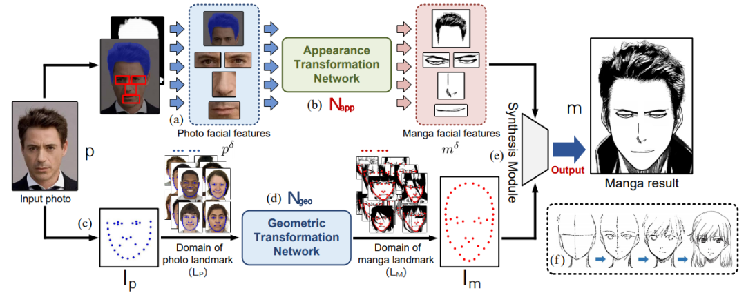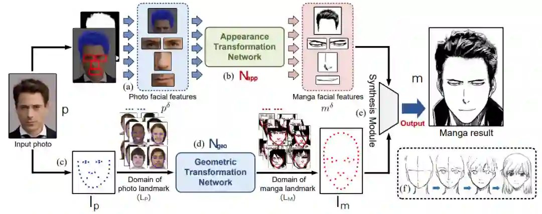 这篇论文中提出了「MangaGAN」,这是一种基于生成对抗网络(GAN)的非成对照片到漫画转换方法。用来训练 MangaGAN 的数据集也来源于一部非常受欢迎的漫画作品——久保带人的《死神(Bleach)》,包含漫画人脸的面部特征、特征点、身体等元素,所以生成结果也带有强烈的久保带人风格。总体来说,MangaGAN 包含两个分支:一个分支通过几何转换网络(Geometric Transformation Network,GTN)学习几何映射;另一个分支通过外观转换网络(Appearance Transformation Network,ATN)学习外观映射。