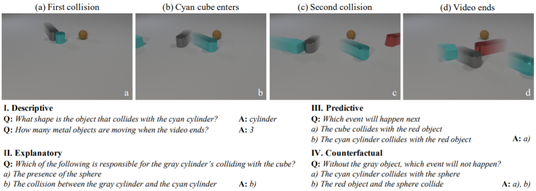 CLEVRER 包含 20,000 个关于碰撞物体的合成视频以及 300,000 多个问题和答案。问题的类型包括以下四种,即描述性(「什么颜色」)、解释性(「什么原因」)、预测性(「将发生什么」)和反事实(「如果…会发生什么」)。