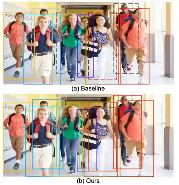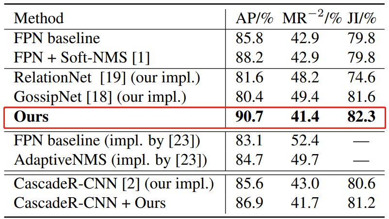相对于经典的 FPN 检测器,该方法在存在大量遮挡的 CrowdHuman 数据集上可以取得明显涨点,在较为稀疏的数据集例如 COCO 上,也会有少量的性能提升。
