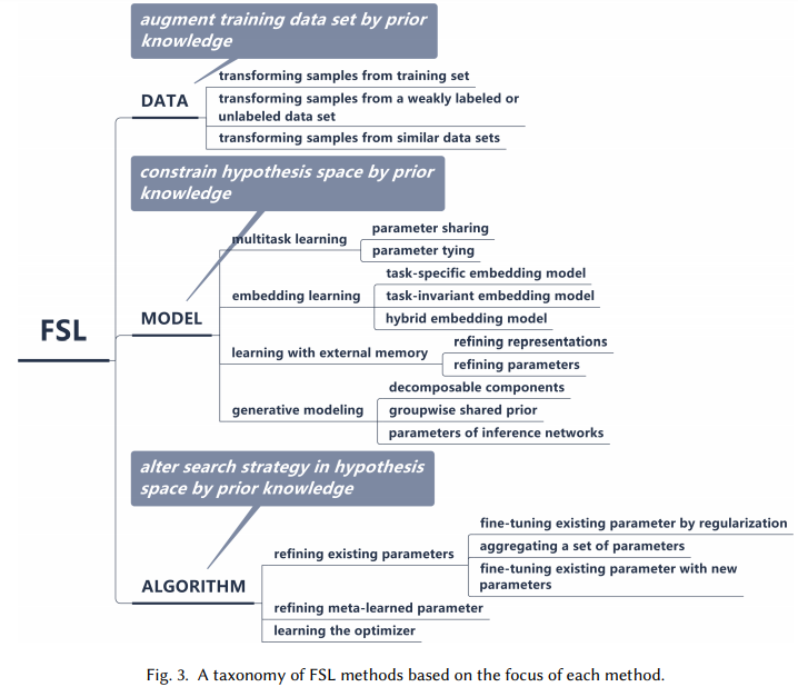 在这篇论文中,来自香港科技大学和第四范式的研究者对 FSL 方法进行了综述。首先该论文给出了 FSL 的正式定义,并厘清了它与相关机器学习问题的关联和差异(弱监督学习、不平衡学习、迁移学习和元学习);然后指出 FSL 的核心问题,即经验风险最小化方法不可靠;最后,根据各个方法利用先验知识处理该核心问题的方式,该研究将 FSL 方法分为三大类:数据:利用先验知识增强监督信号;模型:利用先验知识缩小假设空间的大小;算法:利用先验知识更改给定假设空间中对最优假设的搜索。