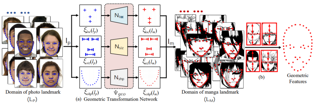 几何转换 GTN 的 pipeline。几何信息被分为三种独立属性:位置、大小和脸型,然后使用 N_loc、N_siz、N_sha 三个 sub-GAN 分别进行转换。