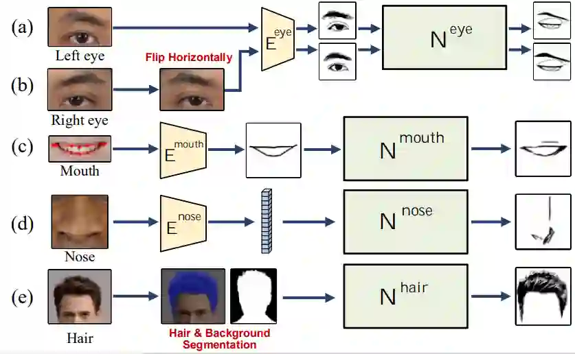 外观转换 ATN 是 multi-GAN 结构的网络,包含四个局部 GAN,分别用来转换眼、口、鼻和头发这四个面部位置。针对每个部位的 GAN,会有专属的训练策略和编码器以改善其性能。