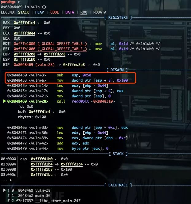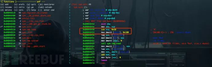 使用radare2简要分析vuln_stacksmash。vuln()函数中,调用 read(int fd,void * bu,size_t count)时未检查缓冲区大小,导致栈溢出。