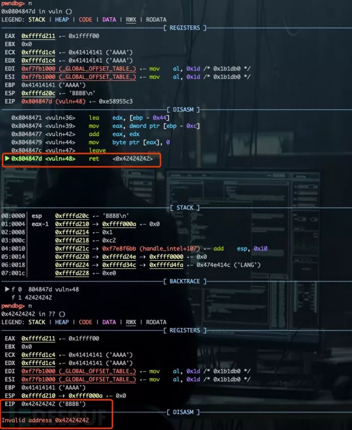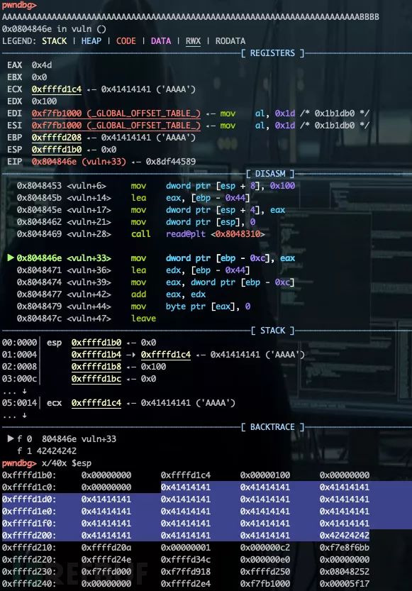 跟踪至vuln()返回,触发异常,EIP被劫持为“\x42\x42\x42\x42”。