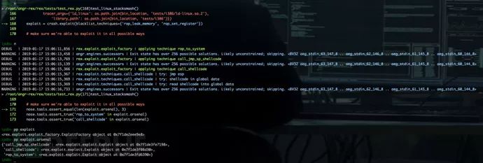 代码中设置了rop_leak_memory、rop_set_register、 explore_for_exploit三种利用方式。通过阅读源码可知,rop_leak_memory、rop_set_register均是针对CGC格式文件的利用技术。在Rex现有的exploit_technique中,call_jmp_sp_shellcode、call_shellcode、rop_to_system三种技术用以针对ELF文件。执行结果如下: