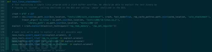 Rex的实现基于Angr,主要采用混合符号执行技术,对原理感兴趣的同学可以阅读论文《(State of) The Art of War: Offensive Techniques in Binary Analysis》。由于封装的原因,整体代码看起来较为简洁,从漏洞复现、漏洞类型判定、Exploit生成到Exploit有效性验证,共计10行代码。其中,Crash类用以复现漏洞并返回漏洞类型,Exploit类用以判定漏洞的可利用性,并生成Exploit。171 ~ 174行用以验证Exploit的有效性。