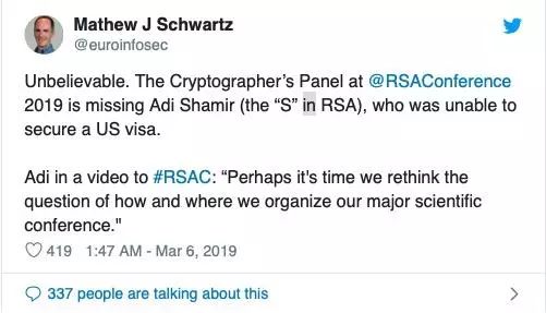 via https://www.cnet.com/news/adi-shamir-couldnt-get-us-visa-to-attend-rsa-conference-named-for-him/?