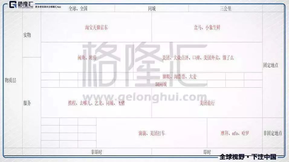 在《移动互联网下半场中腾讯的机遇与挑战》一文中,对互联网信息层与工具层做了较多的讨论,这篇主要围绕物质层来讨论,谈的是阿里、美团、滴滴、携程等的故事,主角是美团点评,会以其视角分析(后文美团点评简称美团)。