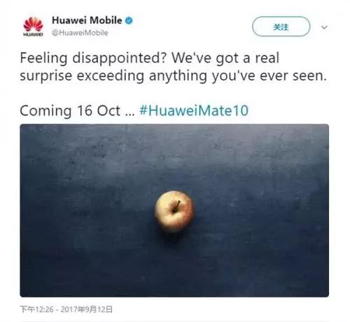 9月13日消息,苹果秋季新品发布会结束了,网友们对于三款iPhone新品有些失望。现在最新消息,华为官方在推特称,“Feeling disappointed?…Coming16Oct…HuaweiMate10”。