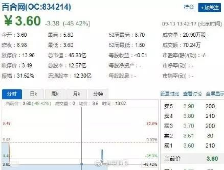 9月13日消息,新三板公司百合网股价暴跌,跌幅为48.42%,WePhone创始人苏享茂被前妻翟某“勒索”导致自杀的消息正在继续发酵。