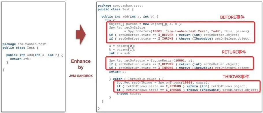 要采集方法路径,首先需要感知到每个方法的执行。利用 JVM-SANDBOX 底层模块的能 力,能统一在每个内部方法做代码增强,感知到每个方法“运行前”、“返回前”、“异常后”三 个事件,从而收集到代码执行到的方法数据,聚合成方法链路。
