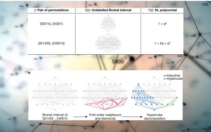 在本例中,他们使用了一种图神经网络(graph neural network,GNN),以求 Bruhat 区间图和 Kazhdan-Lusztig(KL)多项式之间的关系。图神经网络的一个好处就是能够对庞大的、单凭头脑难以处理的图进行计算和学习。深度学习将区间图作为输入,尝试预测相应的 KL 多项式。