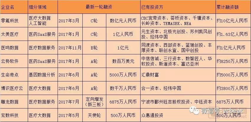 医疗大数据领域的创新公司亦值得关注,投资机构在此领域也跟进活跃。