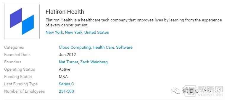 Flatiron创办于2012年,成立之初就致力于以大数据分析为肿瘤治疗提供帮助。该业务模式很快得到了业界的认可,陆续获得了Google Ventures领投的A轮和B轮融资。
